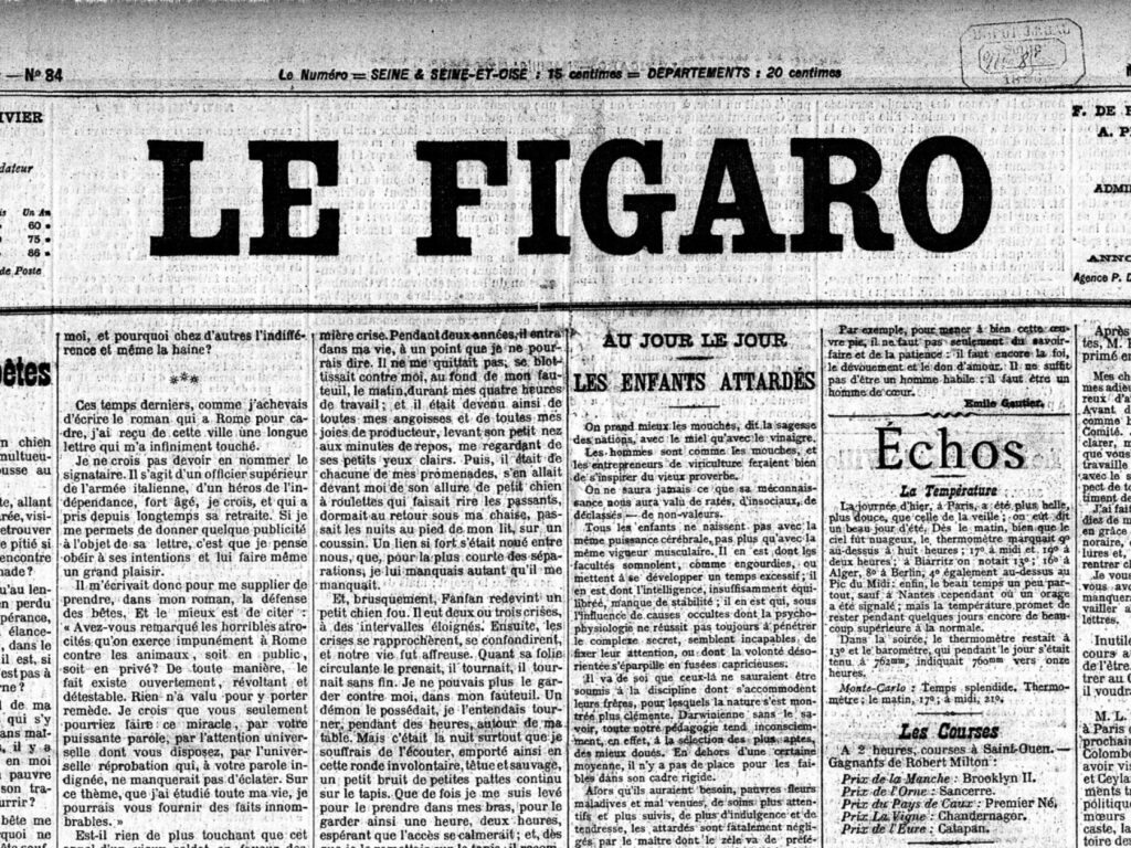 24 mars 1896 – Publication du plaidoyer « L’amour des bêtes » d’Émile Zola en Une du Figaro 1800 - 1899 Articles de presse & blogs France Société