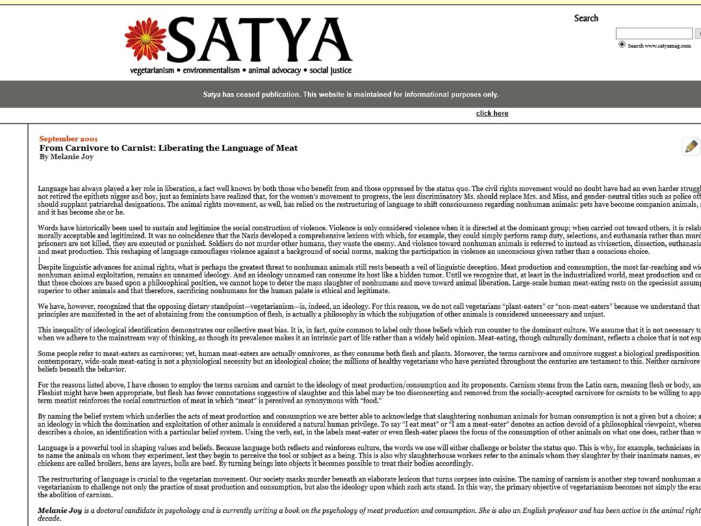 26 septembre 2001 – Création du terme « carnisme » par Melanie Joy 2000 - 2009 Articles de presse & blogs États-Unis Philosophie